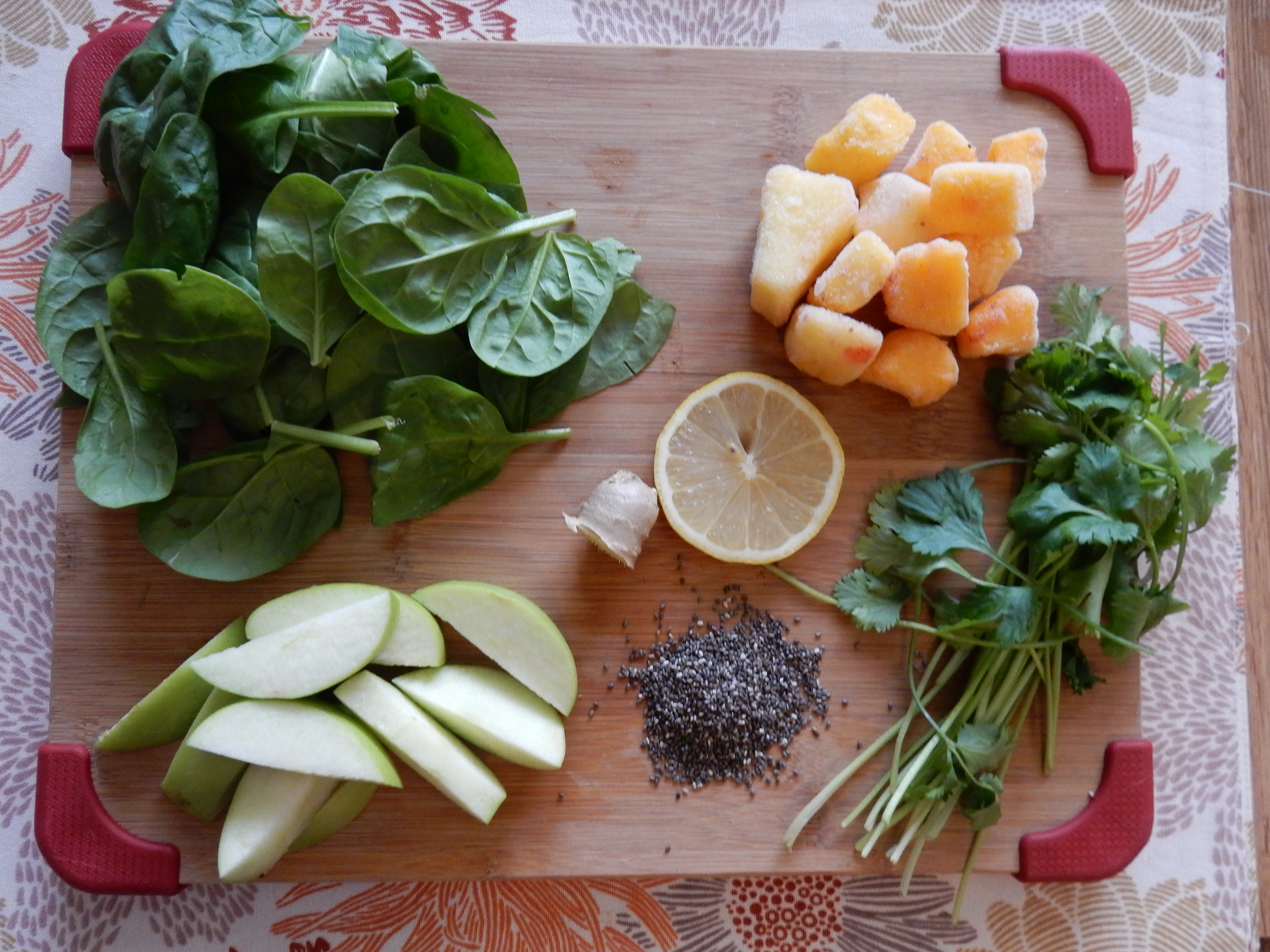 - Place spinach, cilantro, pineapple, apple, and ginger in a blender. Try to place the tougher stuff (like frozen pineapple, ginger, and apple) closer towards the blade and spinach more at the top.