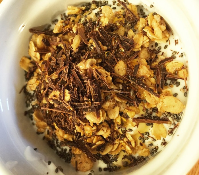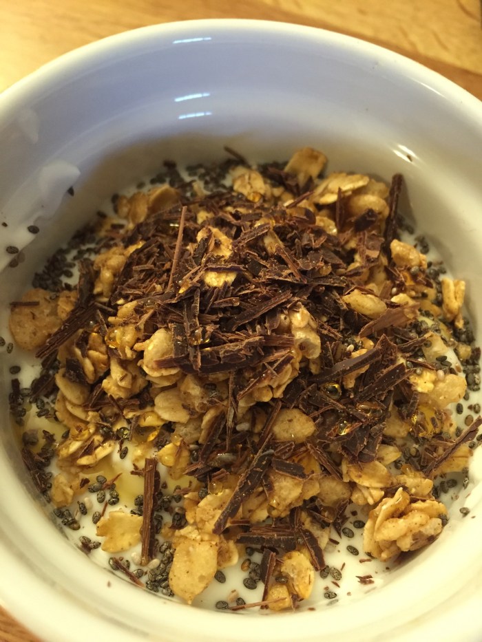 - Remove yogurt from fridge, top with granola and shaved chocolate and enjoy 🙂